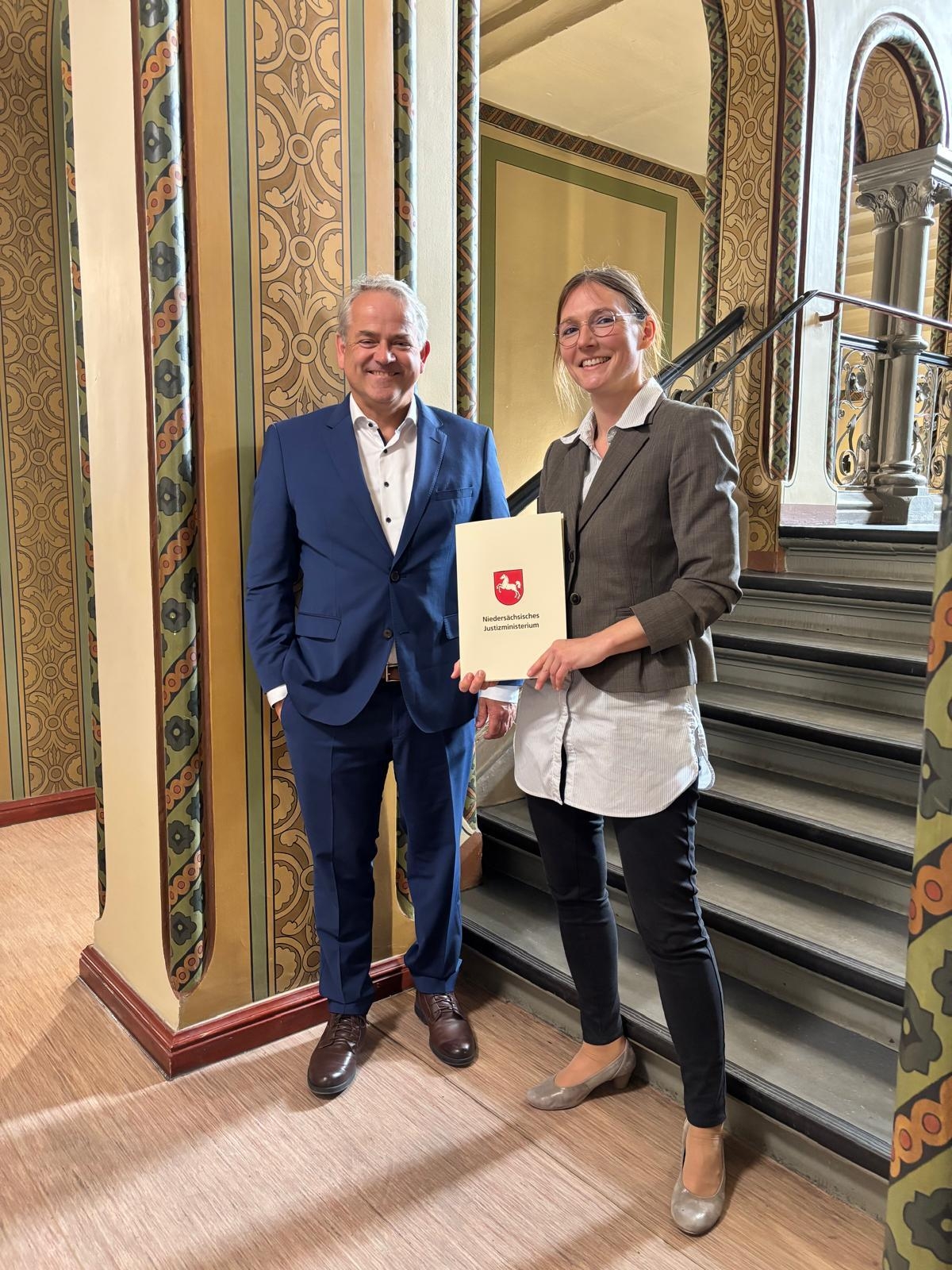 OSNABRÜCK. Richterin am Landgericht Anna-Susanna Hagenbäumer wurde am Montag, dem 27. April 2026, zur Vorsitzenden Richterin am Landgericht Osnabrück ernannt. Der Präsident des Landgerichts Osnabrück, Dr. Thomas Veen, überreichte der 43-jährigen Juristin die von der Niedersächsischen Justizministerin Dr. Kathrin Wahlmann unterzeichnete Ernennungsurkunde.