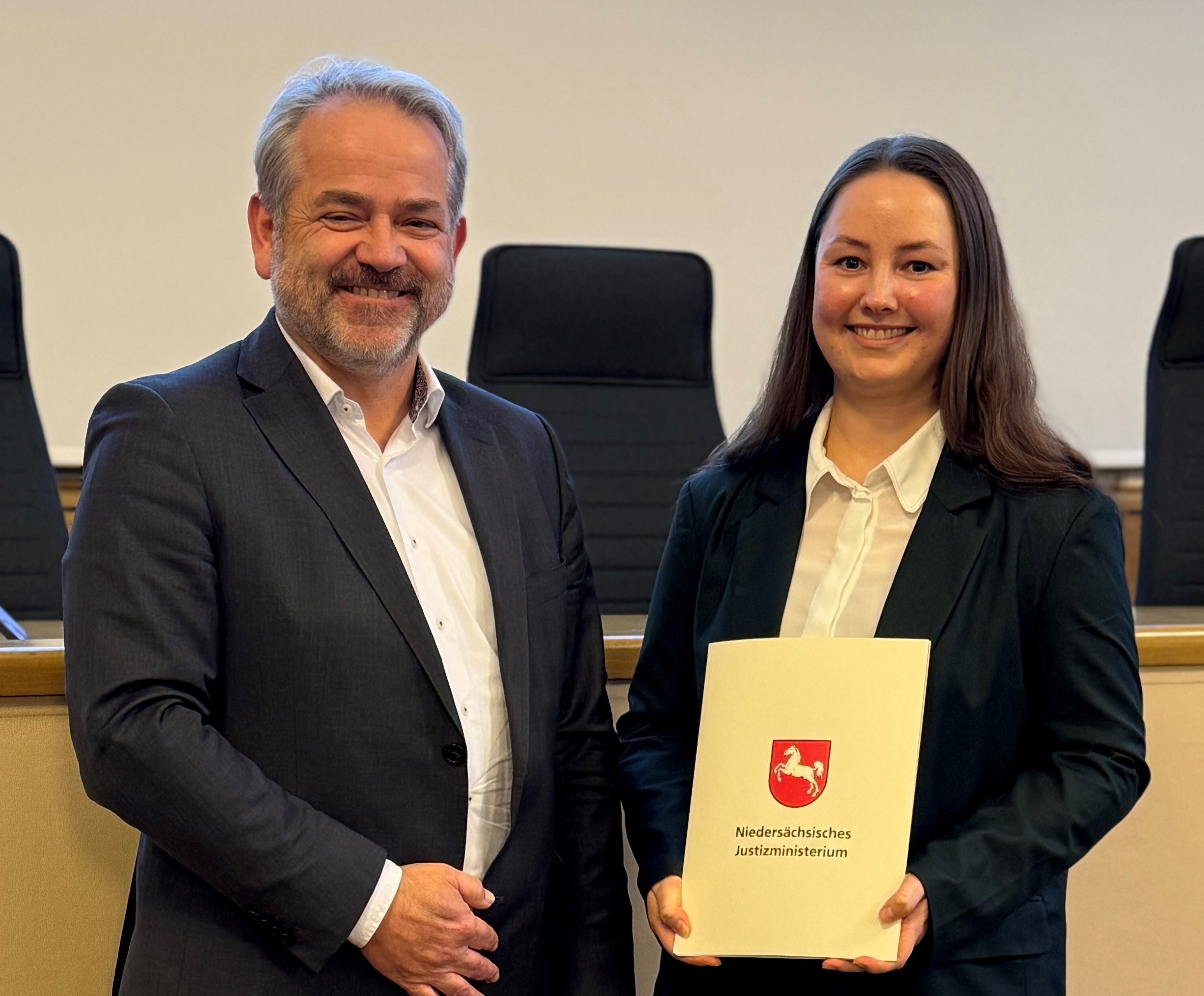 OSNABRÜCK. Frau Franziska Schütte-Özdemir ist am 2. Dezember 2024 zur Richterin am Landgericht Osnabrück ernannt worden. Der Präsident des Landgerichts Dr. Thomas Veen überreichte der Juristin die von der niedersächsischen Justizministerin Dr. Kathrin Wahlmann unterzeichnete Ernennungsurkunde.